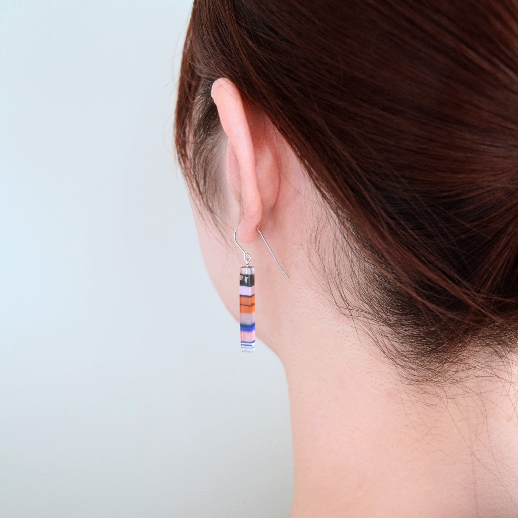 耳元で揺れるスティックピアスは、カラフルで透明感があり、シンプルながら存在感のあるデザインです。