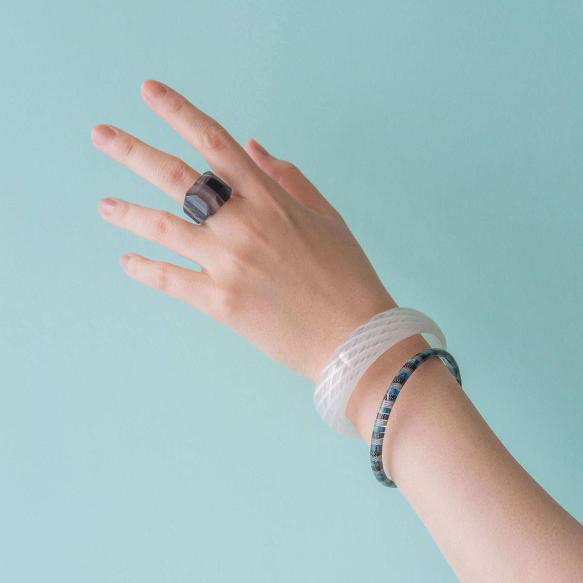 ショーケース越しに差し込む光が黒とシルバーのコントラストと幾重にも重なり、静かに揺れる。淡いグレーや水色の透明感の奥にほのかな陰影を宿した、深みと艶をまとったシックなカラー。